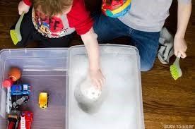 Create a car wash! Gather some toy cars, old toothbrushes, paint brushes or sponges. Fill a bucket up of warm water and add lots of soapy bubbles. Find toy money or use pennies (dependent on age) and pretend to pay for a car wash. Get your children using their resources to wash your car! Encourage role play and taking on other roles through this activity. If you’re feeling extra energised, get your children to help cleaning your family car, give them a sponge and some water and support them washing whilst building on their independence.